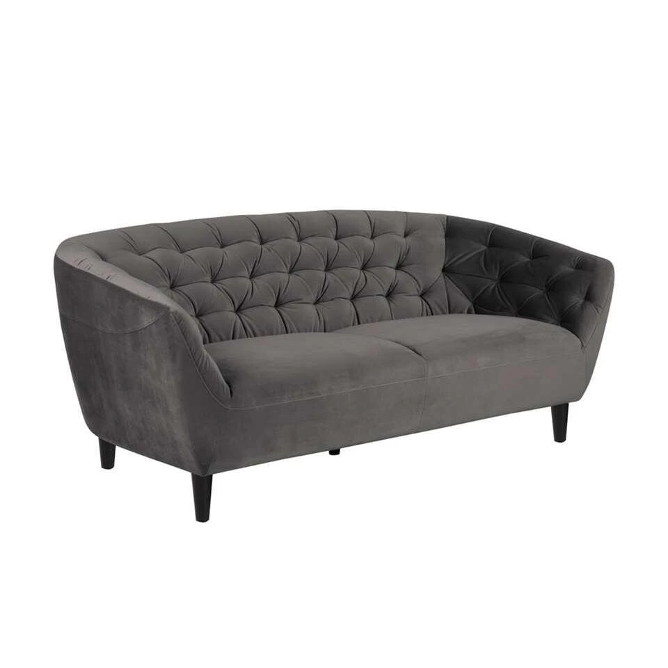 Bank Thyrza is een opvallende verschijning. Dit bankje is bekleed met donkergrijze velvet stof en heeft een echte retro look. De rugleuning is hoog en gecapitonneerd.