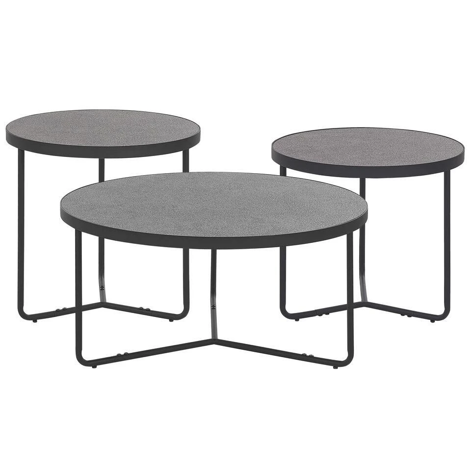 Moderne, drie-delige salontafelset. Geef je woonkamer een modern karakter en creëer een stedelijke sfeer met deze industrieel-geïnspireerde 3-delige salontafelset. Het ronde tafelblad in een lichte houtkleur is de perfecte plek om kaarsen, planten en foto’s te presenteren of warme dranken aan gasten te serveren. De multifunctionele set bestaat uit drie bijzettafels in verschillende maten (klein, medium en groot). De meubels kunnen worden gebruikt als nachtkastjes of als een accent in de hal.