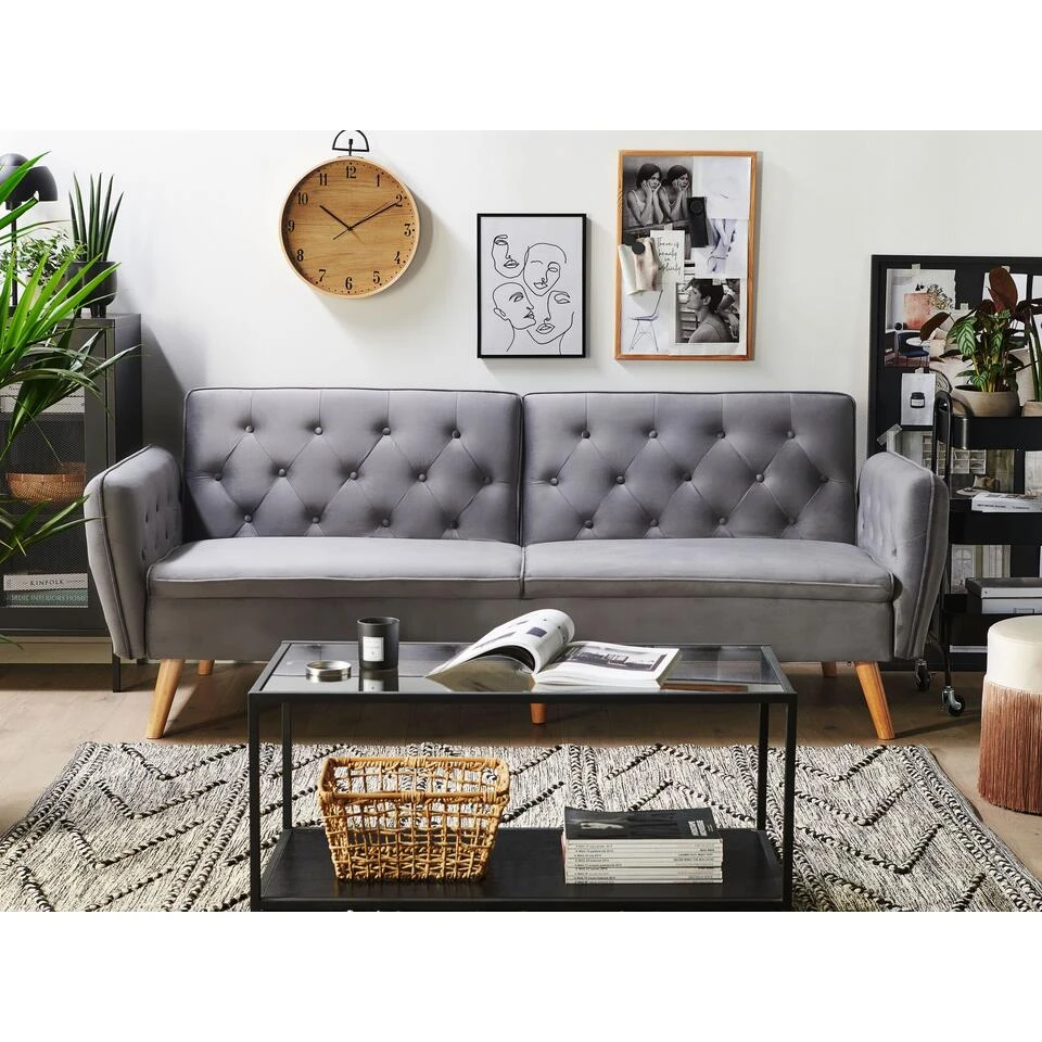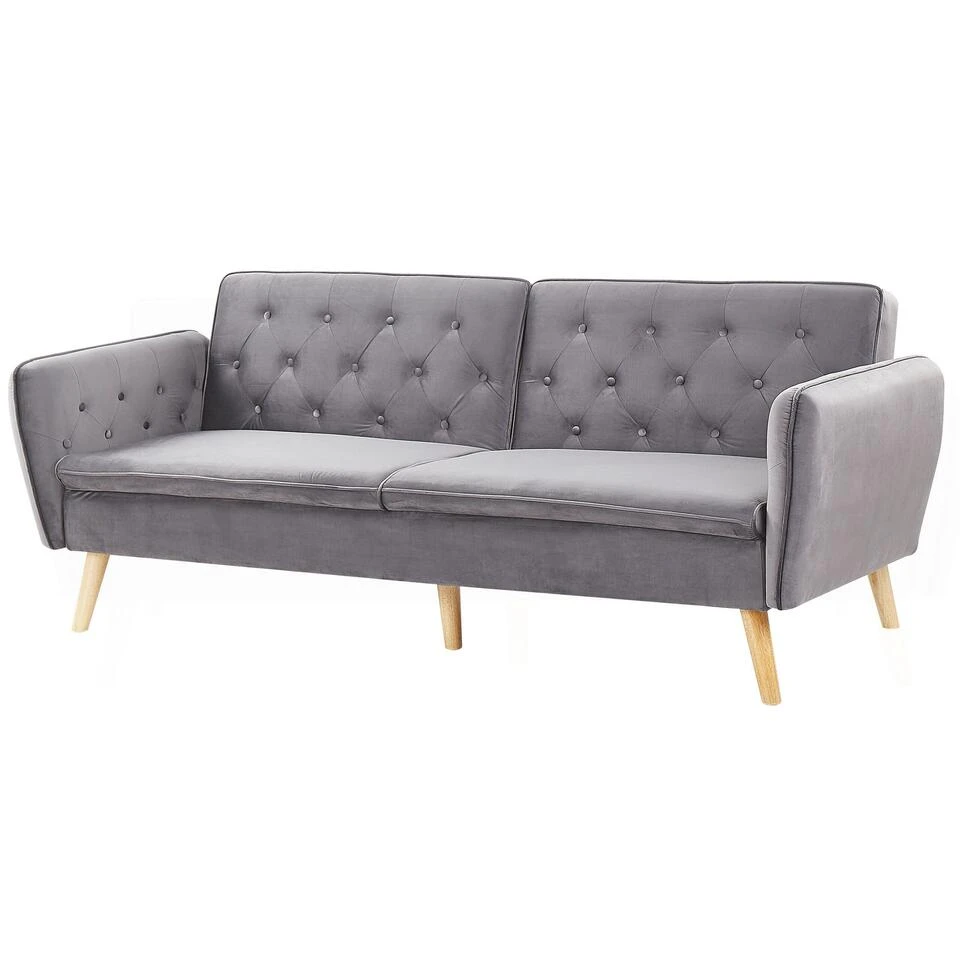 Decoratieve tweezits bank met praktische slaapfunctie. Deze unieke slaapbank is een uitstekende keuze voor iedereen die op zoek is naar functionele en decoratieve meubelstukken. De knoopstiksels geven de grijze bank een modern en glamoureus karakter, dat nog eens extra wordt benadrukt door de smalle armleuningen en de hoogwaardige fluwelen stof. De brede poten van rubberboomhout staan garant voor veel stabiliteit en zijn prachtig te combineren met alle inrichtingsstijlen van je woonkamer of logeerkamer.