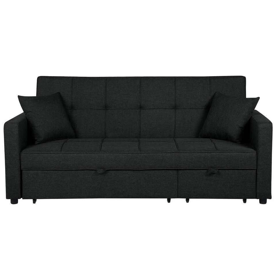 Slaapbank met twee decoratieve kussens. Deze functionele en toch decoratieve slaapbank is dankzij het strakke design een ideale aanvulling op minimalistische, traditionele en moderne interieurs. De bank is royaal opgevuld met lichtgewicht en pluizig schuim en biedt het grootste comfort. De extra kussens zijn voorzien van een afneembare hoes, wat zich vertaalt in eenvoudig schoonmaken zonder zorgen over vlekken. De polyester bekleding in zwart is voorzien van een biscuit tuft op de zitting en rugleuning die samen met de sierstiksels en de subtiele kunststof poten de bank een frisse, eigentijdse uitstraling geeft. De bank kan gemakkelijk worden omgevormd tot een bed voor je gasten dankzij een handig uittrekmechanisme.