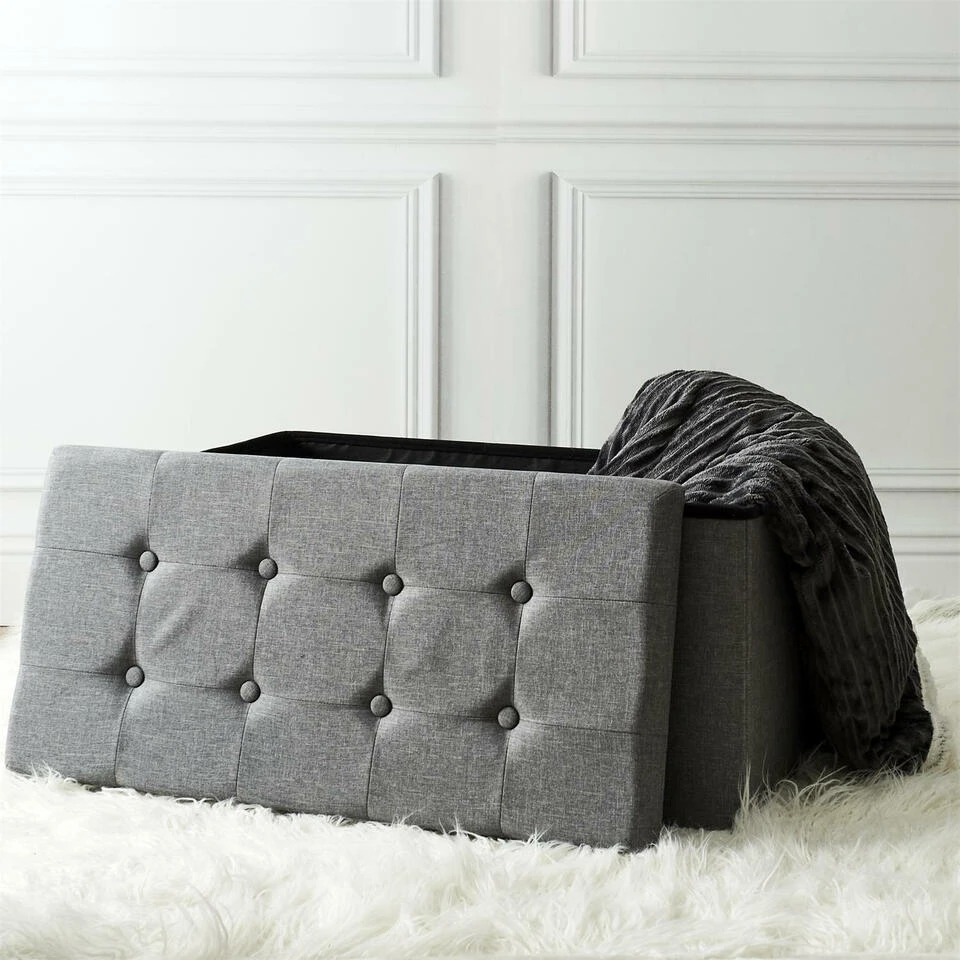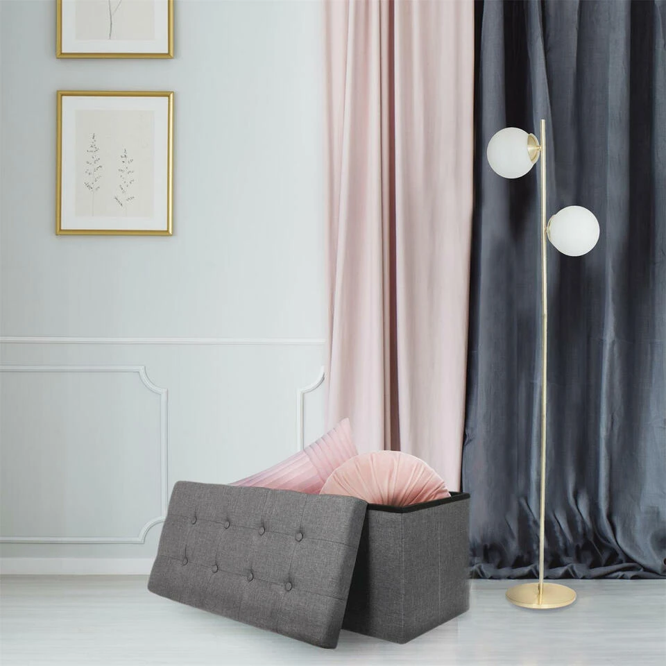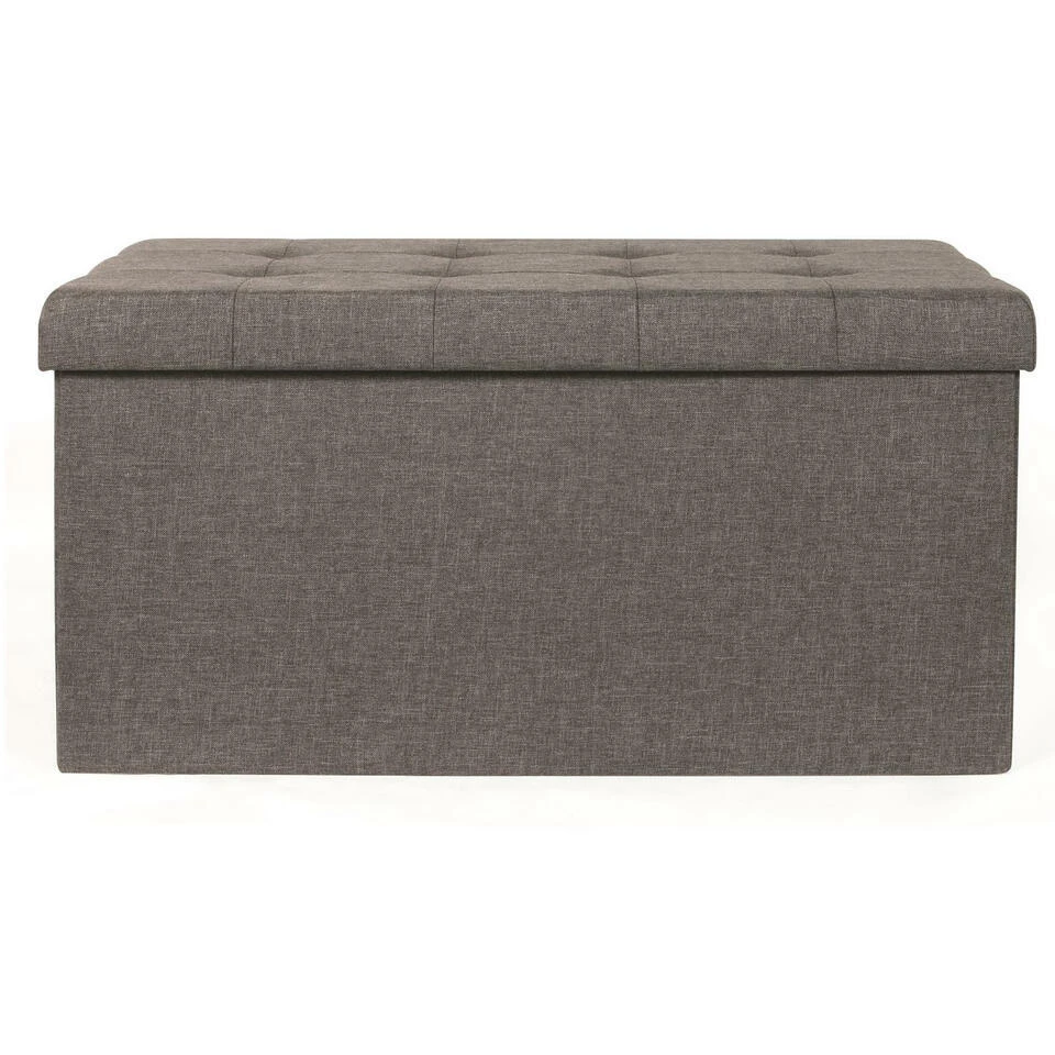 Home Deco poef Chique heeft een fijne opbergruimte waar je ook op kunt zitten. Deze opvouwbare poef, ook wel een hocker genoemd is ideaal voor elk huishouden. De poef heeft een afneembare deksel, geeft je extra opbergruimte en is tevens te gebruiken als voetenbankje. Bespaar ruimte door bijvoorbeeld speelgoed of dekens erin op te bergen of de poef als zitplek te gebruiken. Een mooie aanvulling voor in huis. Kleur: donkergrijs. Materiaal: polyester en mdf. Afmeting: ca. 76 x 38 cm.