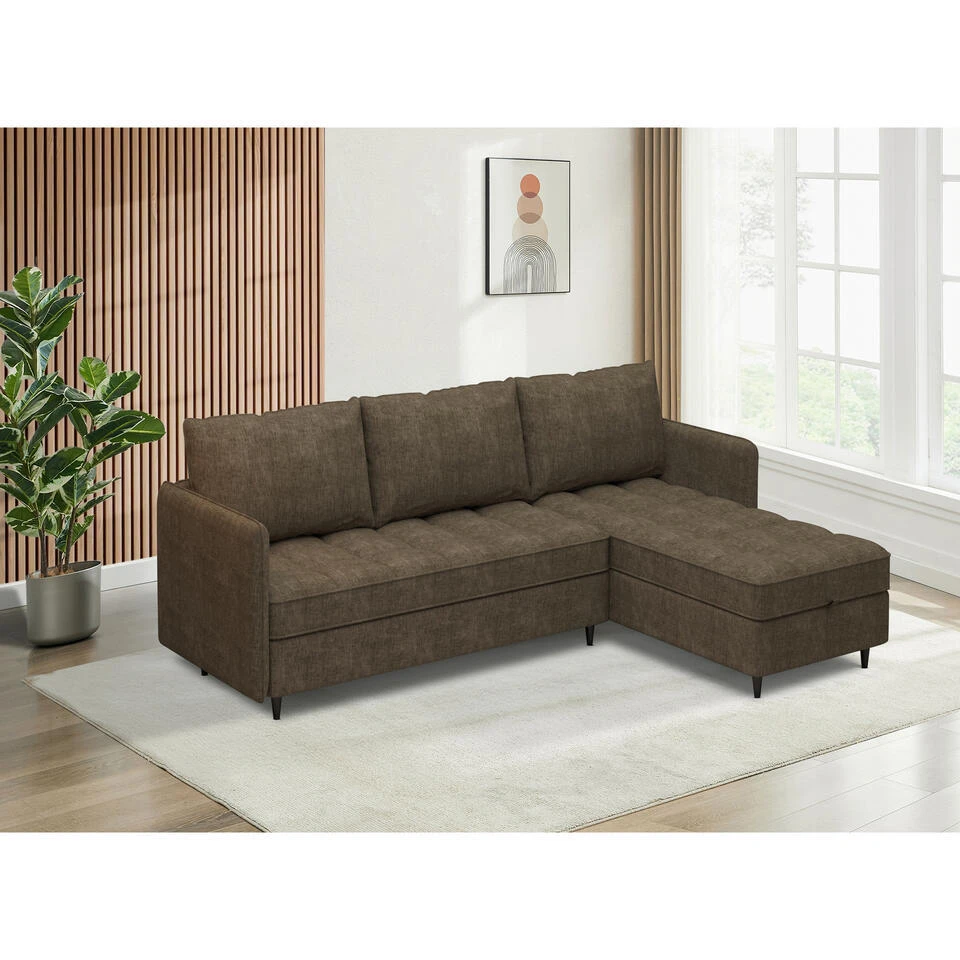 De bank kan ook worden gebruikt als slaapbank, waardoor hij ideaal is voor logés. Het ingebouwde opbergvak onder de chaise longue is perfect om beddengoed, dekens, kussens en andere benodigdheden netjes in op te bergen.