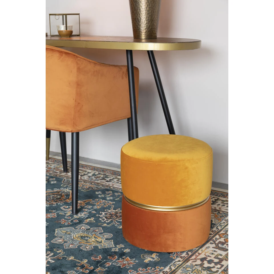Bubble Poef is uitgevoerd in de heerlijke kleur oranje met halverwege een decoratieve gouden ring. Deze ronde is gemaakt van een zachte velvetachtige stof. Breng de herfst in huis met deze poef!